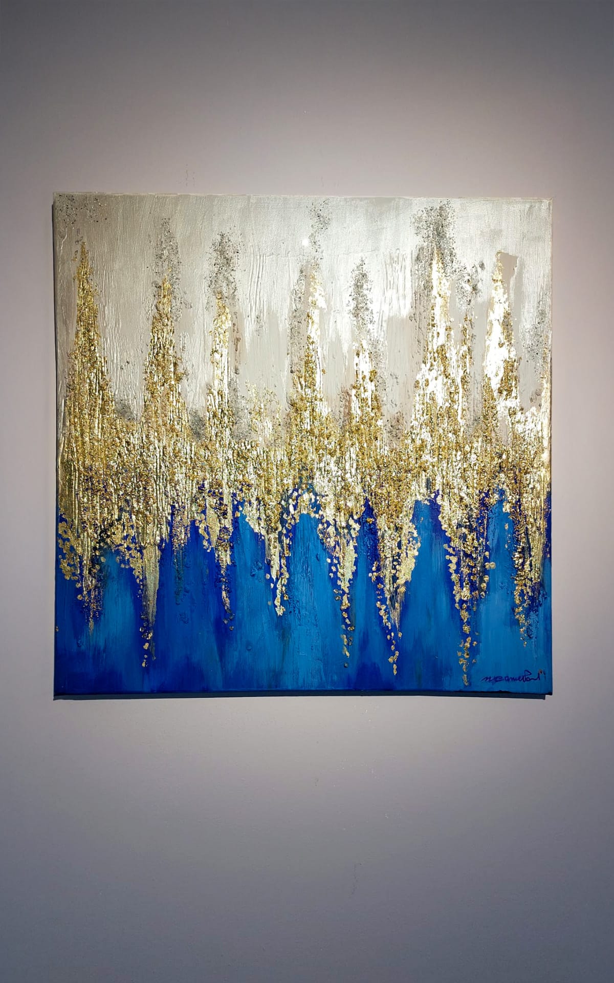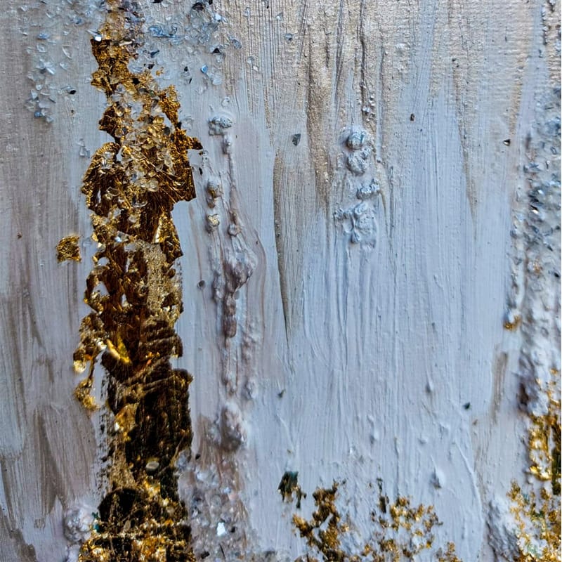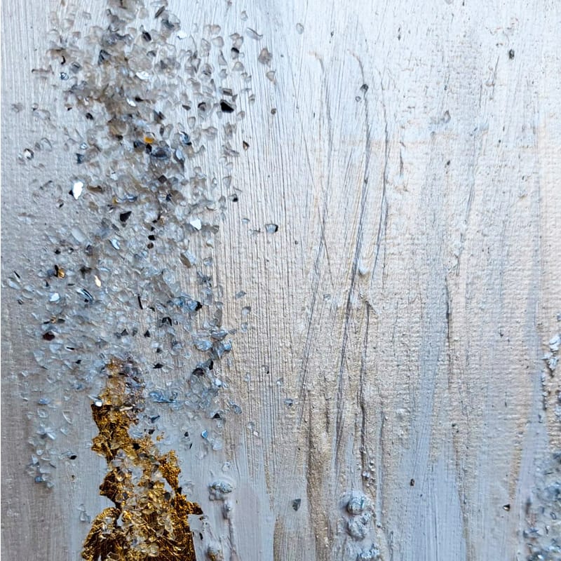 Quest’opera astratta cattura lo sguardo e invita a un viaggio emozionale attraverso una fusione di materiali e colori. La parte superiore, adornata con tonalità chiare, trasmette una sensazione di leggerezza e apertura, evocando cieli sereni e spazi infiniti. Man mano che lo sguardo scende, la transizione verso un blu elettrico intenso crea un contrasto audace, simile a un tuffo nelle profondità misteriose dell’oceano.